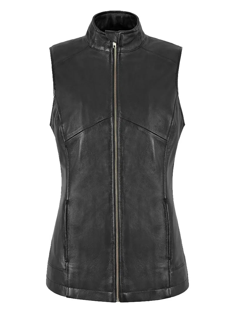 Black Longline Zip-Up Waistcoat in Genuine Leather for Women